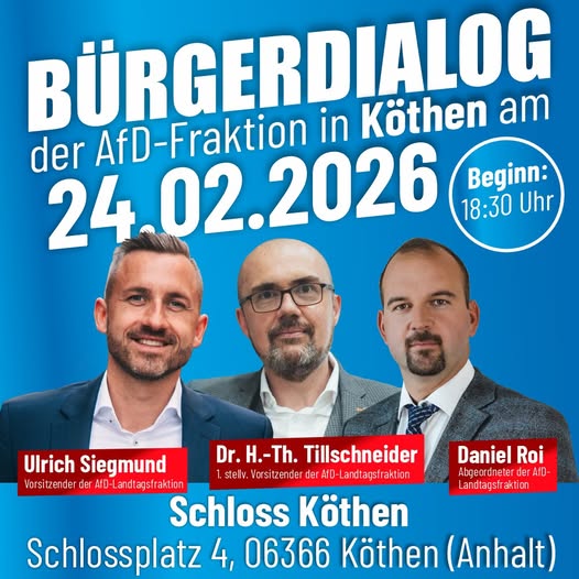 Schloss Köthen (Anhalt) Schlossplatz 4, Köthen (Anhalt)Bürgerdialog mit Ulrich Siegmund MdL, Dr. H.-Th. Tillschneider, MdL und Daniel Roi MdL Veranstaltungszeiten: Einlass: 18:00 Uhr Beginn: 18:30 Uhr Ende: ca. 20:00 Uhr Veranstaltungsort/Objekt: 06366 Köthen (Anhalt), OT Köthen, Schlossplatz 4, Schloss Köthen