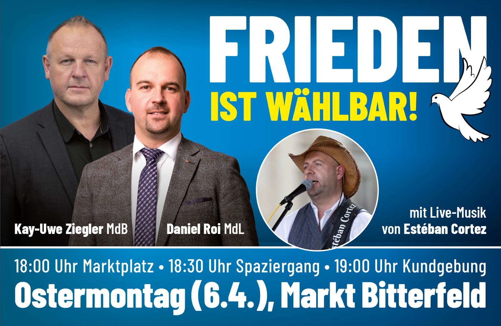 Kundgebung mit Kay-Uwe Ziegler MdB, Daniel Roi MdL Veranstaltungszeiten Beginn: 18:00 Uhr Spaziergang: 18:30 Uhr Kundgebung: ca. 19:00 Uhr Ende: 20:00 Uhr